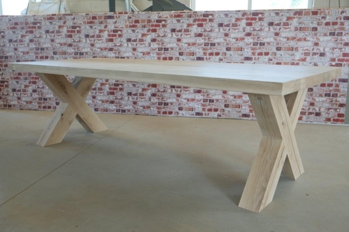 De robuuste X-model poot die onder deze tafel zit bestaat uit massief eiken balken van 14x14cm. Liever een strakkere uitstraling? Kies dan voor wat rankere verlijmde balken.